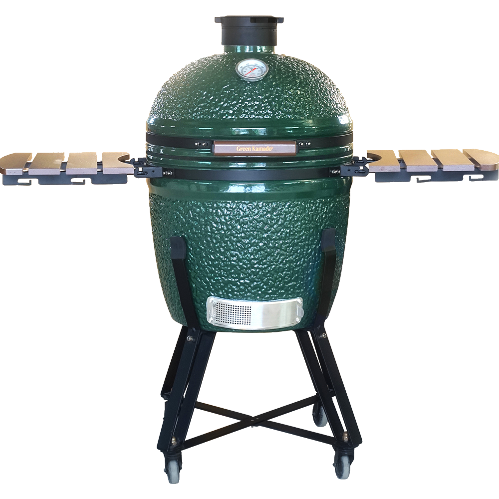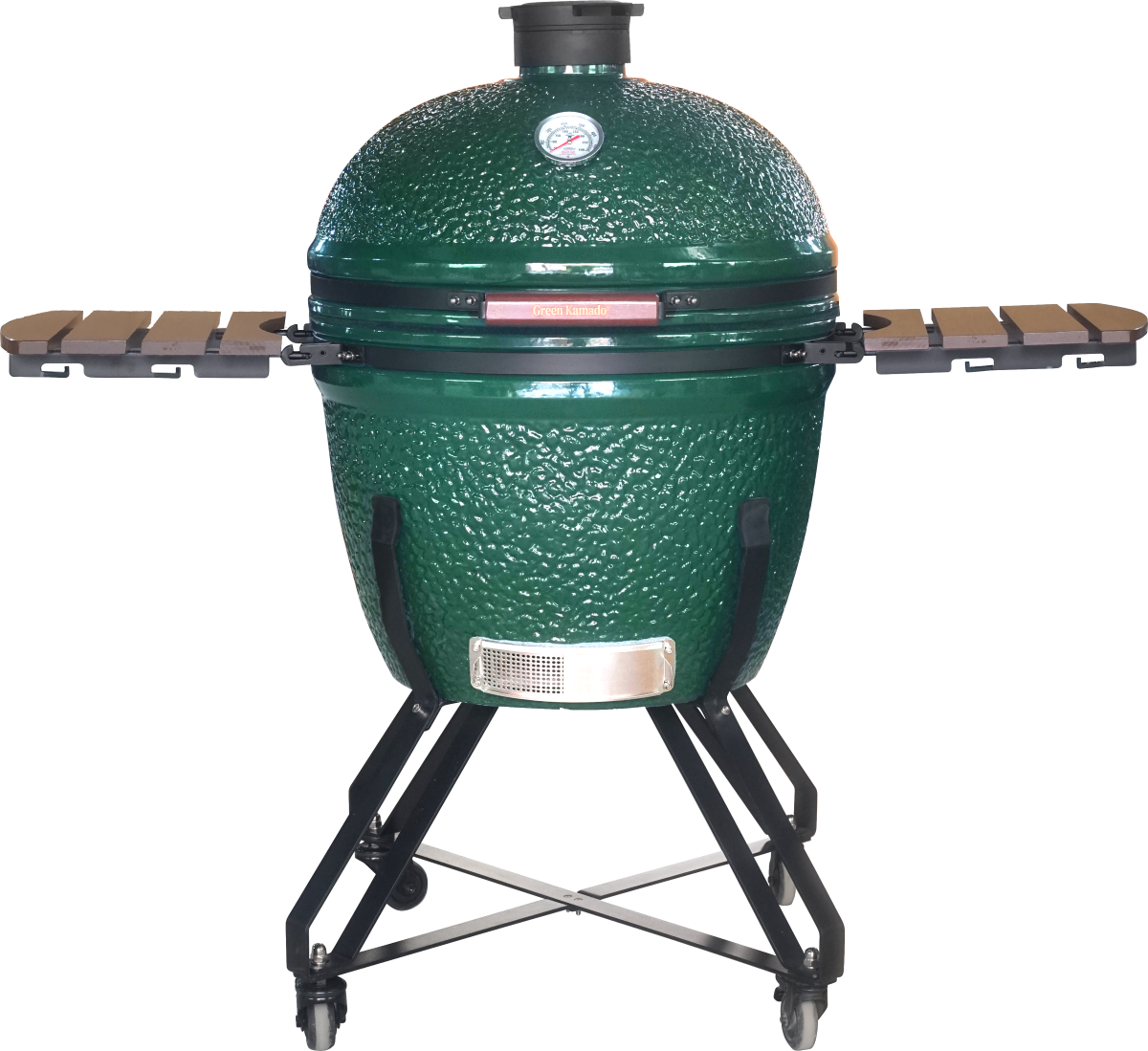 Самый большой керамический гриль Green Kamado. На нём можно приготовить не только большое количество порций еды, но и в режиме печи большие куски мяса, также большую индейку целиком или гигантскую рыбу. Идеально впишется на веранде большого коттеджа. Рекомендуется для большой семьи или большой BBQ вечеринки с количество человек от 8 до 20 человек.