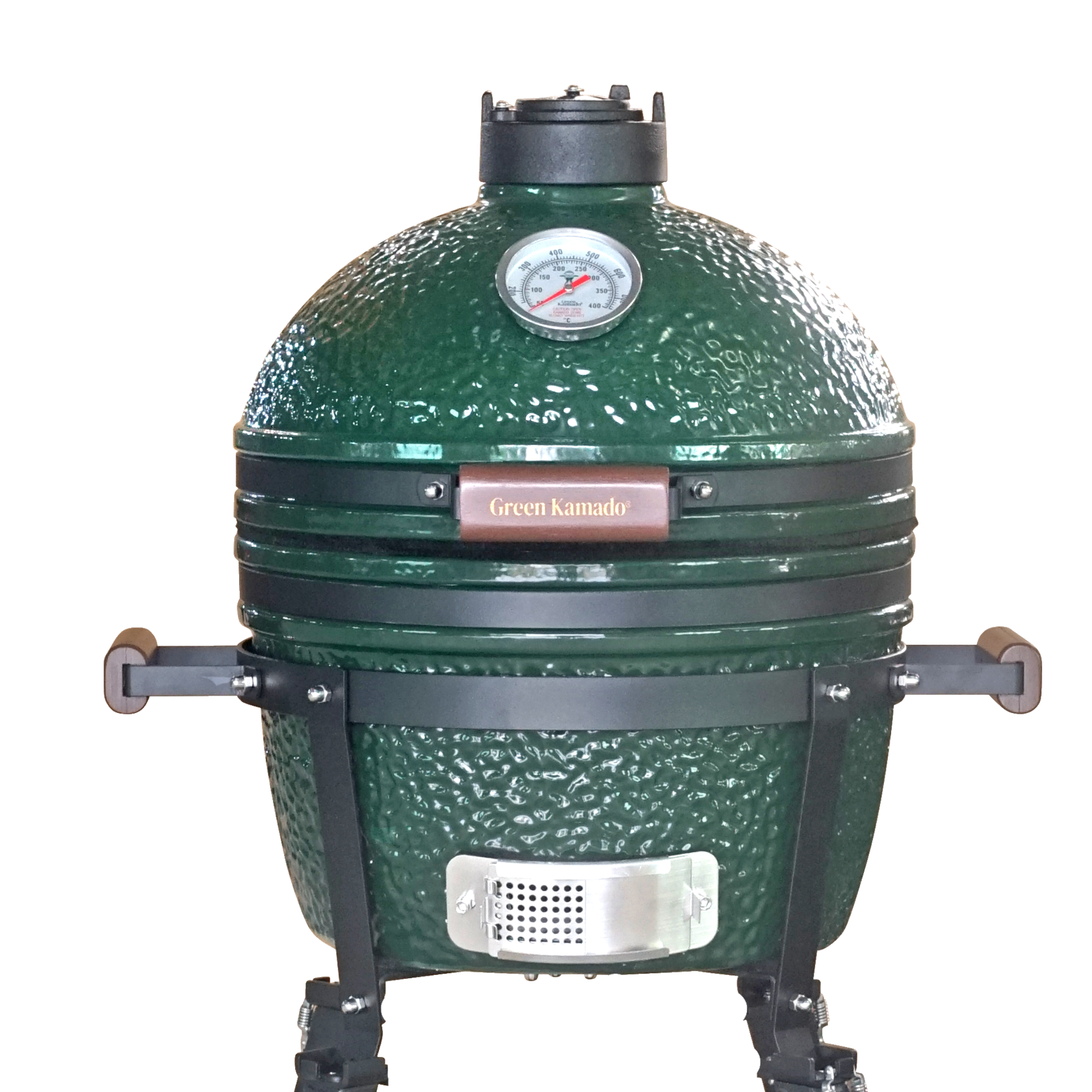 Самая маленькая модель керамического гриля Green Kamado. Важный плюс этой модели малый размер и вес, всего 31 кг. Легко переносится за штатные ручки. Можно перевозить в багажники любого автомобиля. Это настольный вариант гриля, в комплект уже входят ножно на стол и ручки для переноски. Но можно дкупит вспециальные складные ножно для установки на пол.в ком Идеален для пикника, для охоты, на яхту.